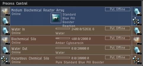Pure Standard Blue Pill Booster: 143 * 17 = 2,430K - this is the material cost per one portion of booster. Production time depends on the skills, I had 3 and a half hours on the production of 10 batches. At a day I can get 72 the party of booster, but haven’t enough materials. So I will get only 42,it cost about 4.5KK * 42 = 189KK.